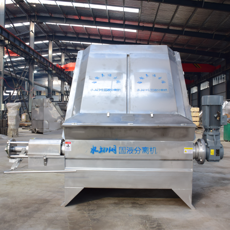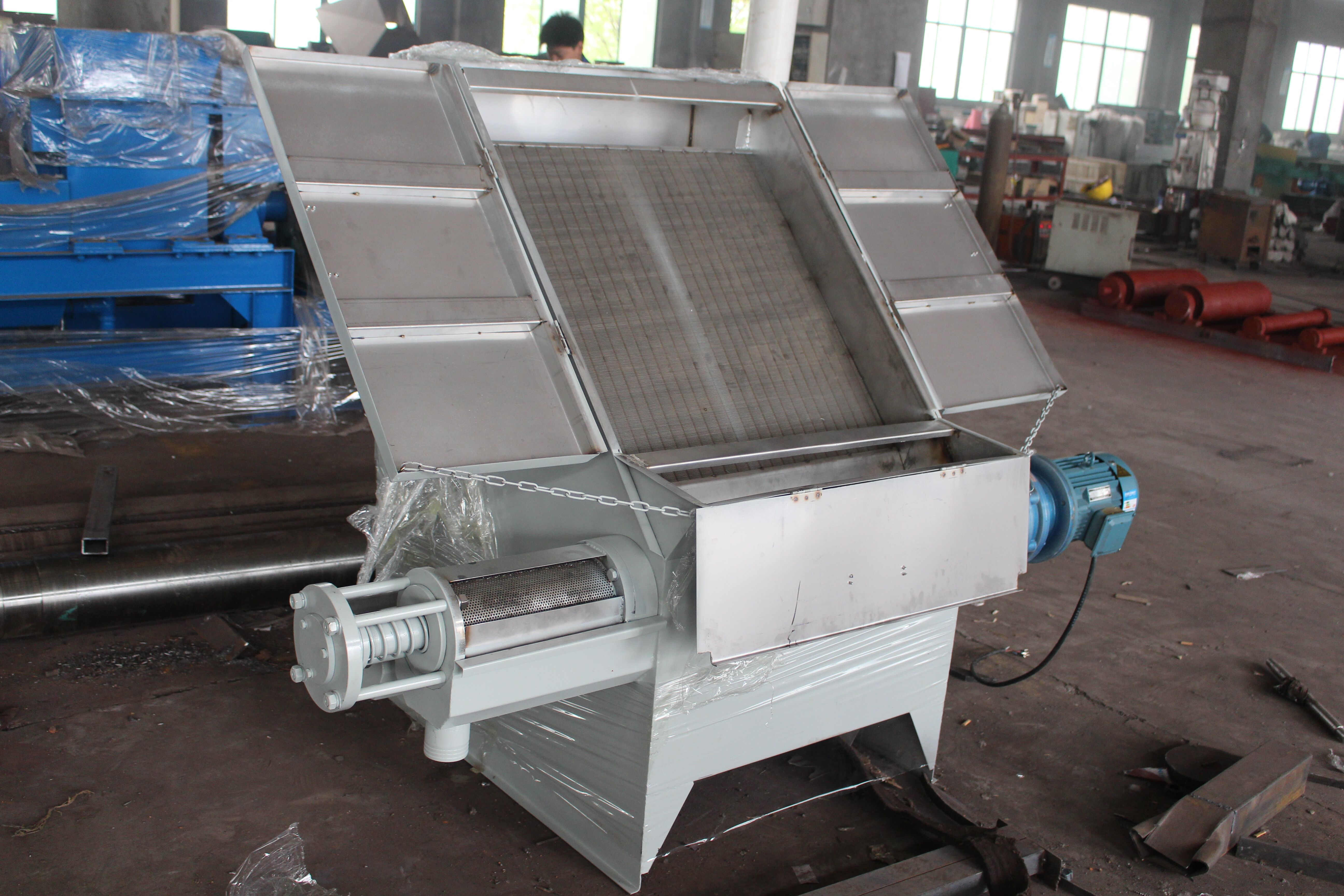 水切网式固液分离机主体为由楔形钢棒经精密制成的不锈钢平面过滤筛面,待处理废水通过溢流堰均匀分布到倾斜筛面上,由于筛网表面间隙小、平滑,背面间隙大,排水顺畅,不易阻塞;固态物质被截留,过滤后的水从筛板缝隙中流出,同时在水力作用下,固态物质被推到筛板下端的螺旋槽里,由螺旋向前推进到挤压段进行再次脱水,脱水后的干渣由出料口排出,从而达到固液分离目的。