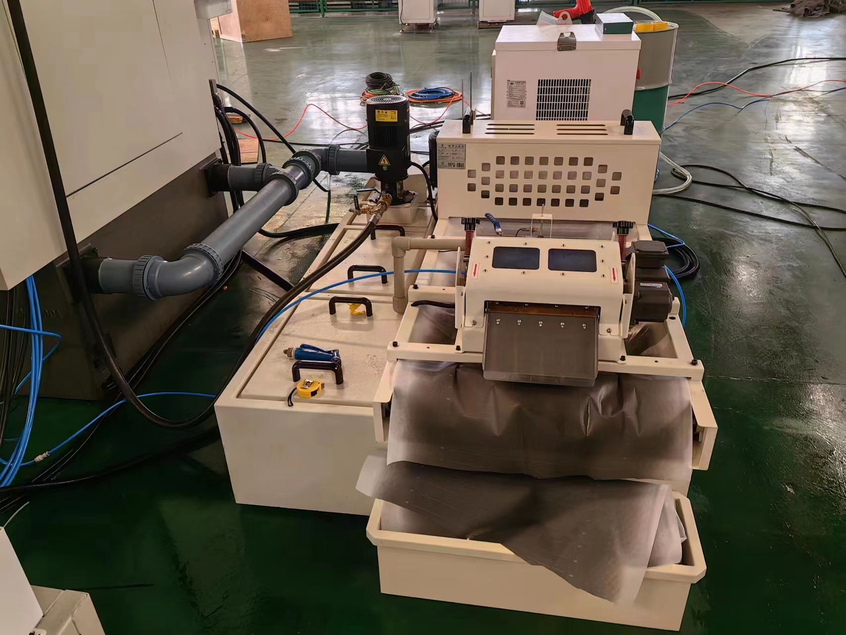 方案中由回液泵抽出的脏切削液通过回液管道直接送入磁性分离装置中,经强力磁滚筒吸附,脏液中大部分导磁性的铁屑杂质被分离出来、紧紧吸附在磁滚筒的表面,由紧压在磁筒上的不锈钢刮板刮下落入接渣车;而经磁性预分离后的切削液已经没有大的杂质,从出液口流出、向下流入真空过滤装置下箱体内作第二级过滤。