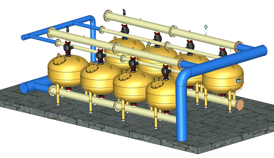 浅层砂过滤器由标准罐体组成,根据流量不同,选用不同个数的标准罐体,允许单个系统过滤流量从20立方米/小时增至1300立方米/小时。