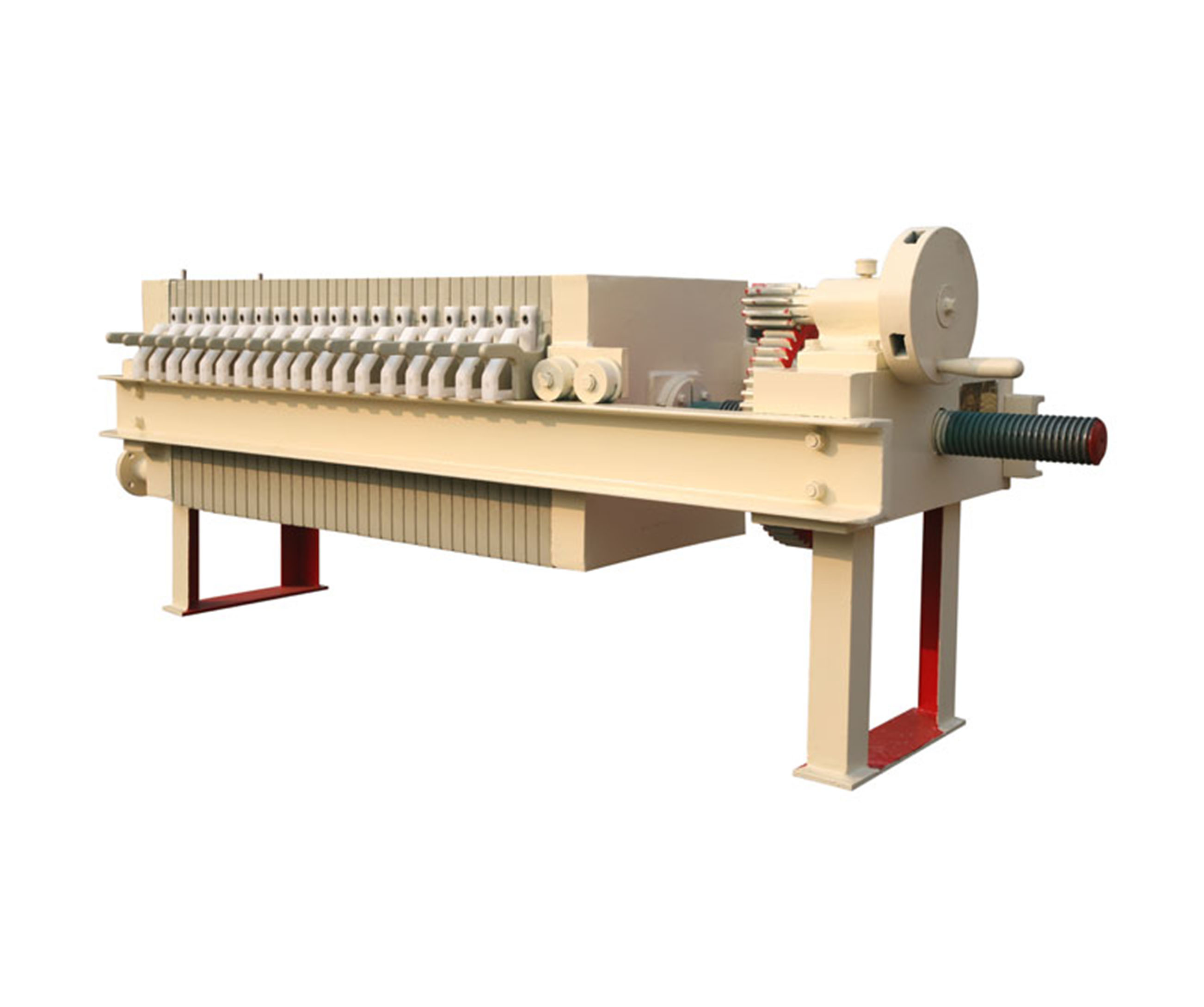 机械压紧压滤机压紧时由电动机带动减速机,经传动部件推动压紧板压紧滤板。压紧螺杆和固定螺母设计有可靠的自锁螺旋角,能保证压紧时的可靠性和稳定性。用电机综合保护器实现自动控制。可对电机实现过热和过载保护。适用于小型过滤行业,一般使用压力较低,过滤压力0.4Mpa—0.6Mpa,过滤周期较长的过滤领域.