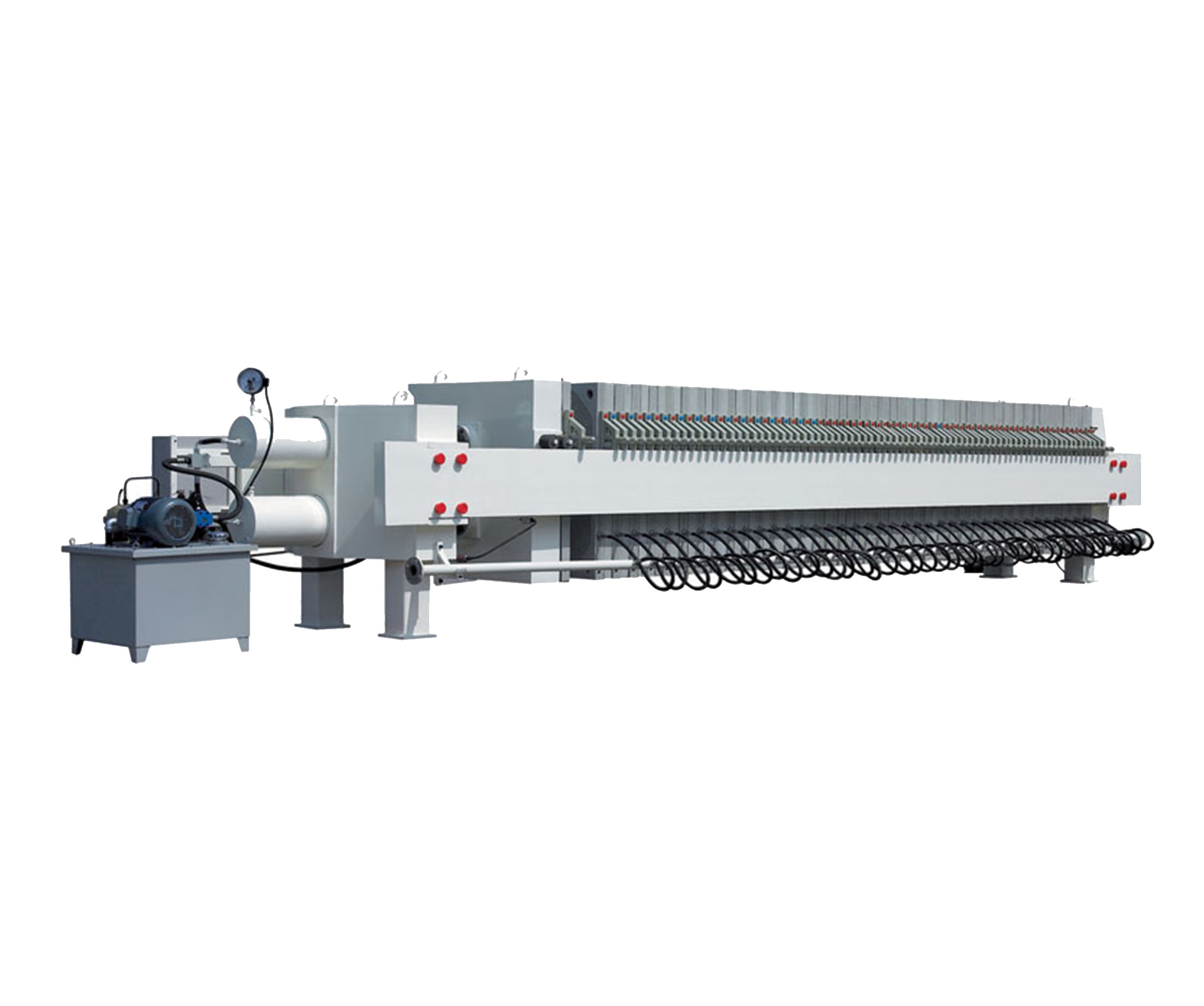 隔膜压榨压滤机是由隔膜板和厢式滤板排列组成滤室,在输料泵的压力作用下将料浆输入滤室,通过过滤介质(滤布)将料浆中的固体和液体分离,当料浆中的固体形成饼后,再向隔膜通入空气,对滤室内的固体充分压榨。降低含水率。尤其对于粘性物料的过滤及对含水率要求较高的用户,此机更有其独特的特性。